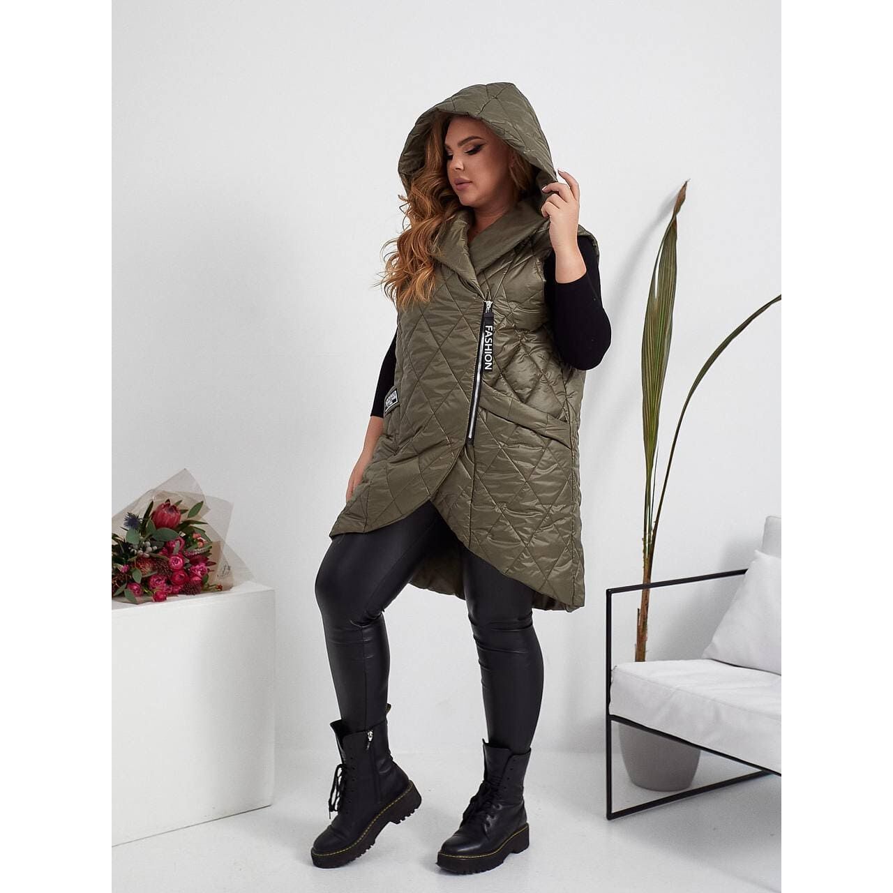 Стильная стёганная жилетка прямого кроя с карманами , удобный глубокий капюшон, качественная фурнитура , нашивка