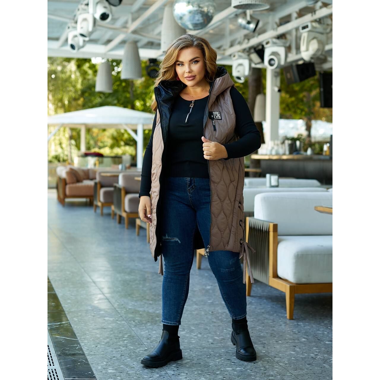 Стильная бедерная жилетка интересного кроя с завязками по бокам, удобный глубокий капюшон, качественная фурнитура, нашивка