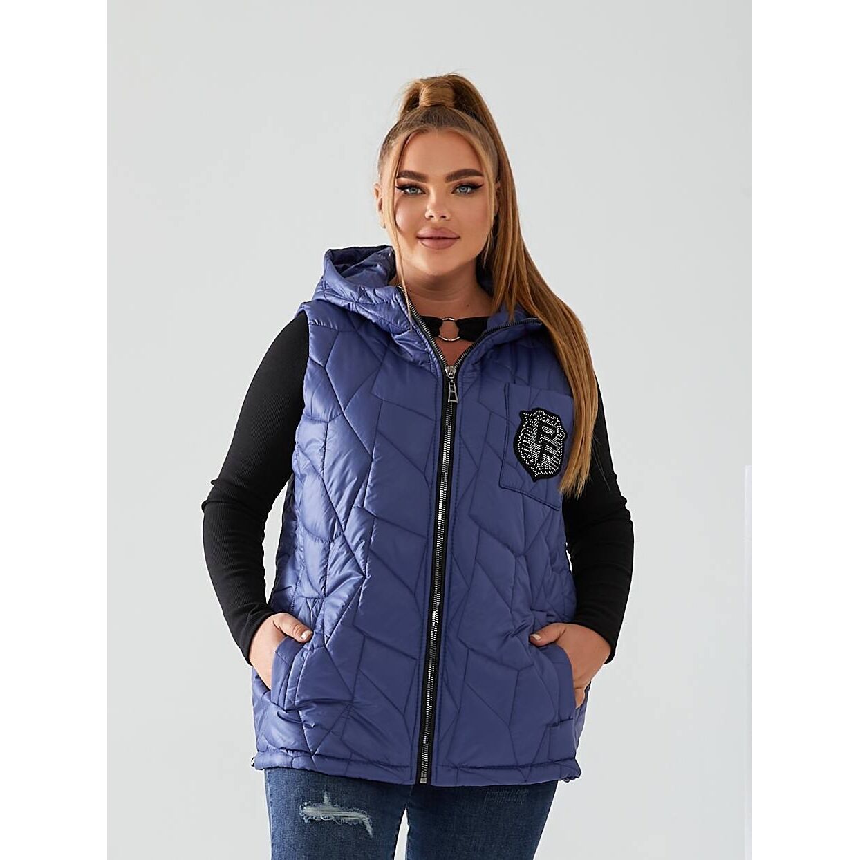 Стильный стеганый жилет с карманами, удобный глубокий капюшон, декорированная нашивкой с камнями, качественная фурнитура.