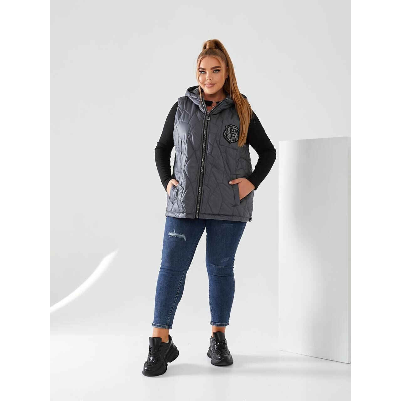 Стильный стеганый жилет с карманами, удобный глубокий капюшон, декорированная нашивкой с камнями, качественная фурнитура.