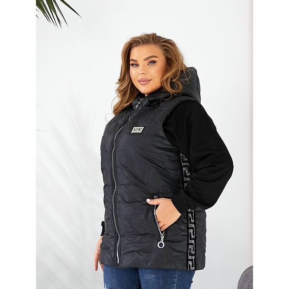 Стильная жилетка прямого кроя с карманами на змейке, удобный глубокий капюшон, декорированный лампами с камнями, качественная фурнитура.