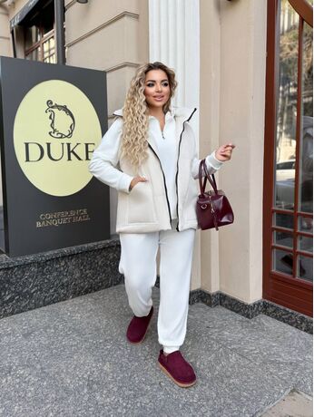 - Костюмы тройка - брюки с кофтой + дутая жилетка с капюшоном или высоким воротником. Это полноценный сформированный образ на сезон весна-осень, который достаточно дополнить соответствующей обувью.