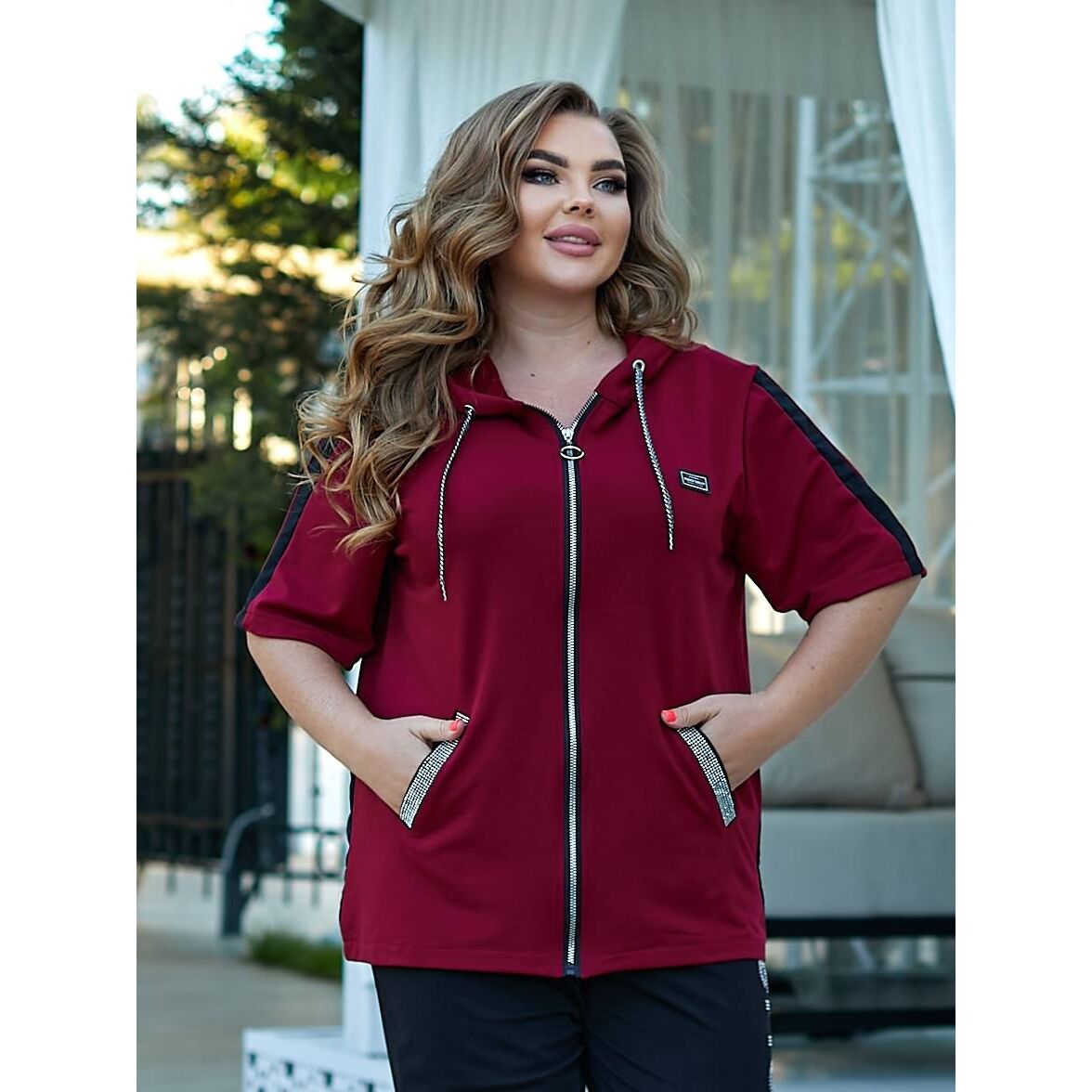 Кофта удлиненная на змейке, декорированная камнями, нашивка (может меняться)