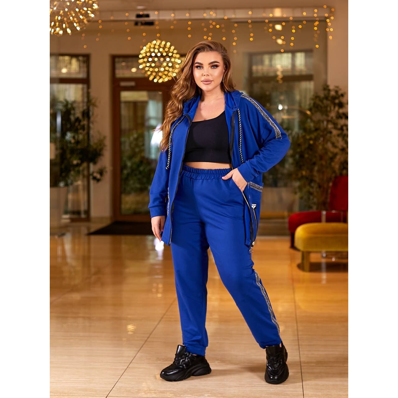 Спортивный костюм с удлиненной кофтой, декорированной змейками и лампасом. Брюки на резинке свободного силуэта, на манжете снизу, декорированные лампасом.